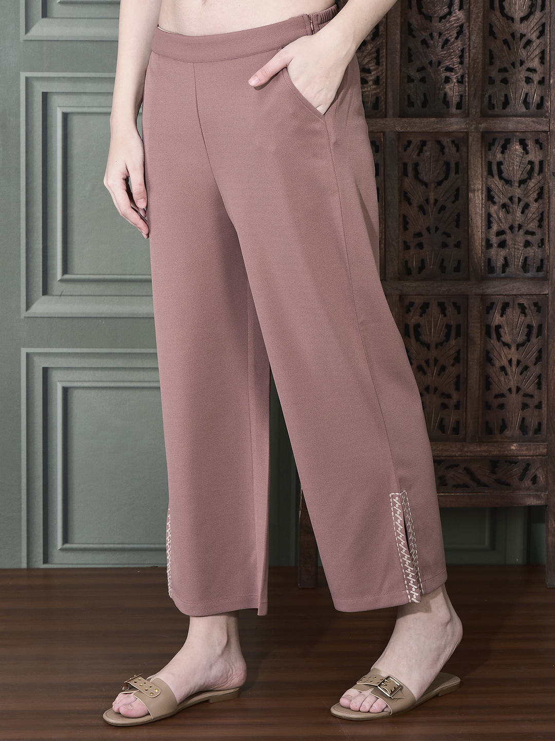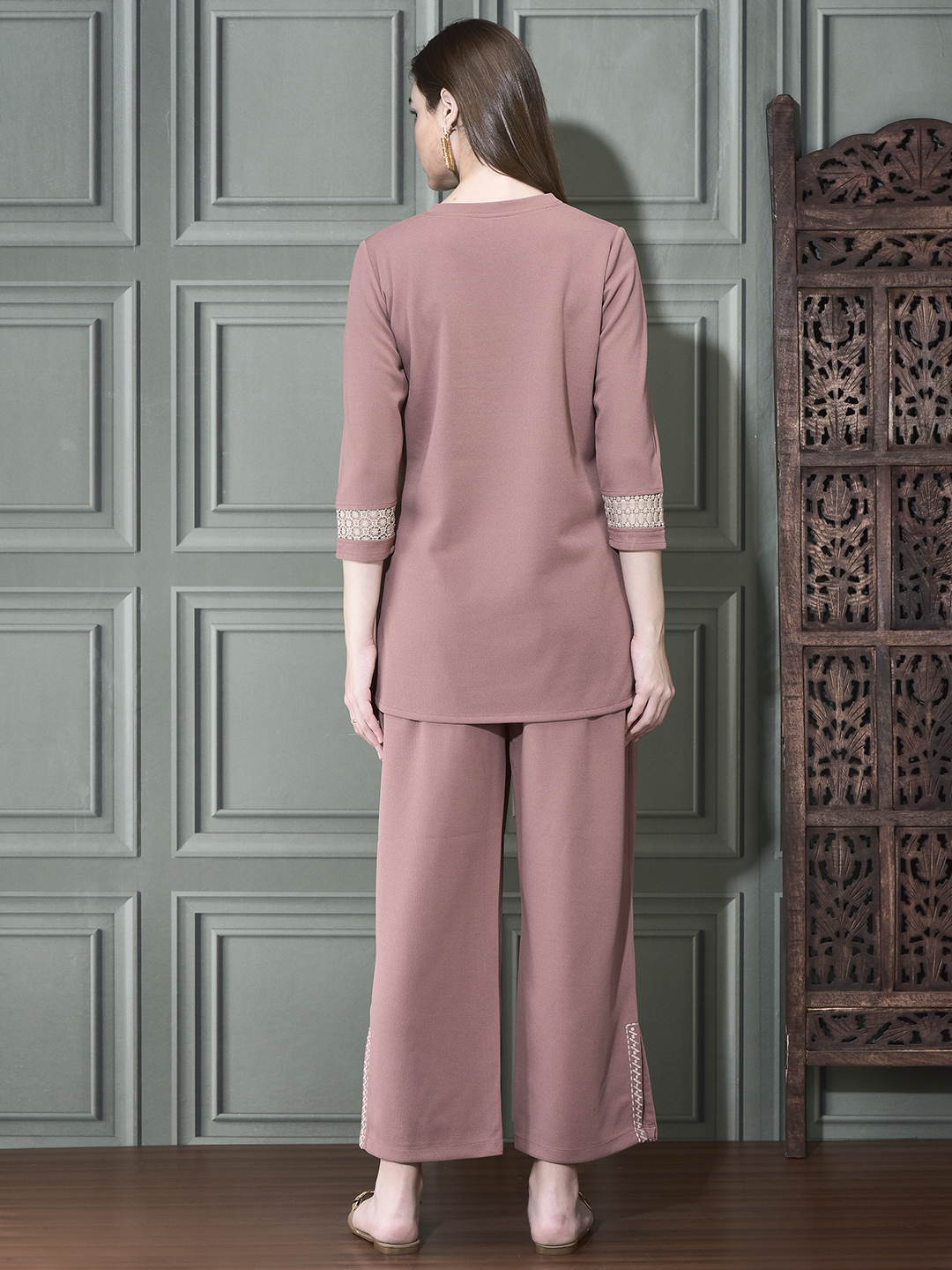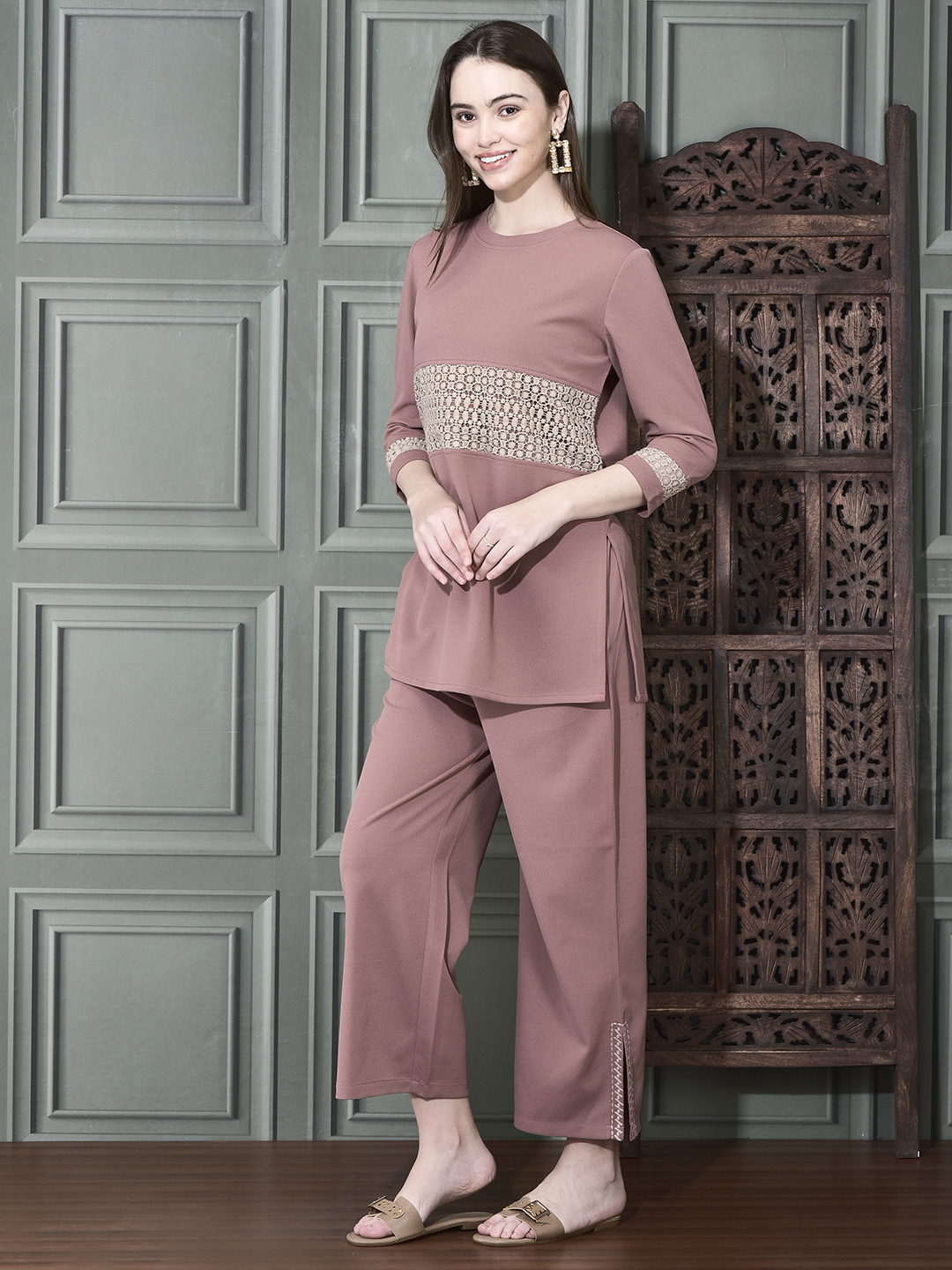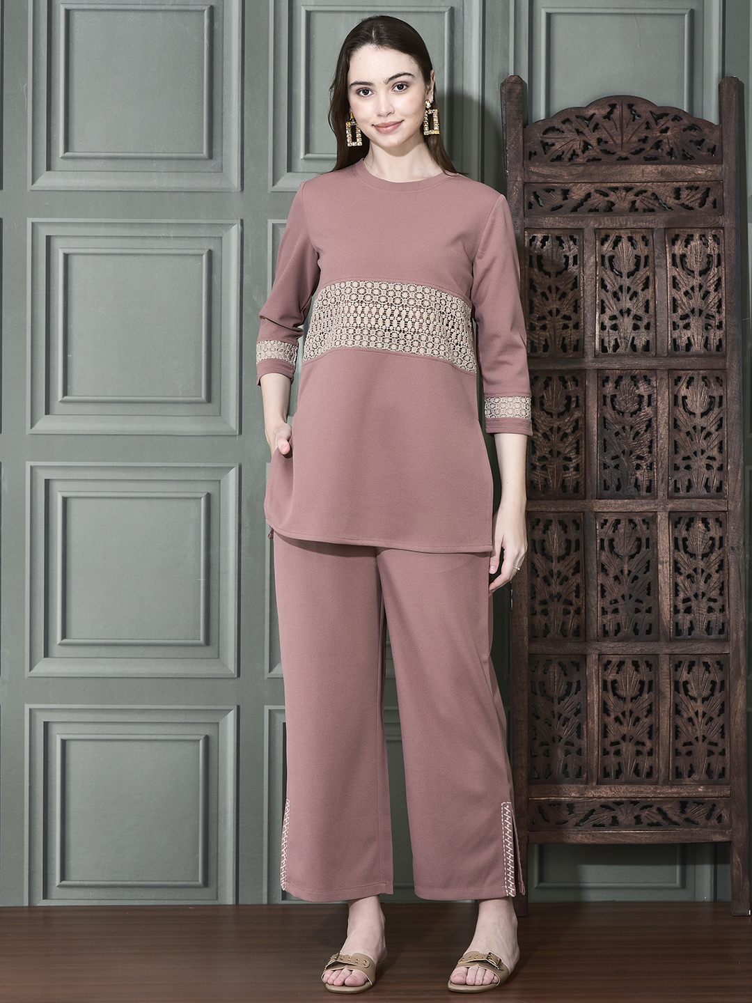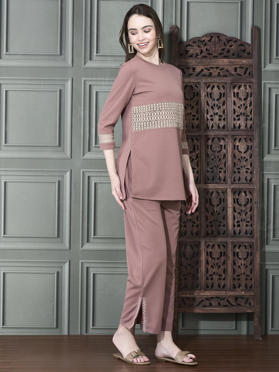 Step into chic winter style with The Modern Stand Winter Co-ord. This sophisticated ensemble is crafted from a warm Poly-Spandex blend that offers gentle stretch and a soft, body-skimming drape, ensuring comfort without sacrificing elegance. The round-neck tunic is highlighted by a stunning wide, contrasting lace/embellished waistband that defines the silhouette Fabric-Warm Poly-Spandex Fit-Relaxed & Straight Fit. The tunic offers a comfortable, A-line drape, and the trousers are cut with a classic straight leg colors- Classic Black, Warm Onion, Earthy Brown